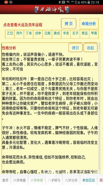 2. 内容丰富:除了基础的八字排盘外,软件还包含了串宫压运、禄马生死关口查询、小儿童关、命宫算命等盲派秘传信息,以及六爻、万年历等实用工具,满足用户多样化的需求。
