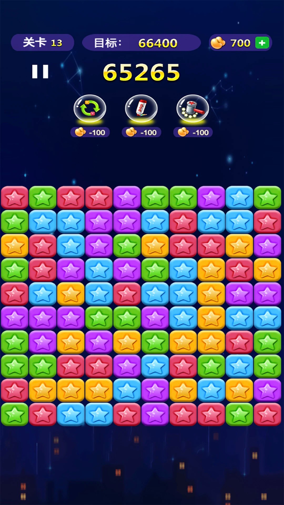 1. 优先消除底层星星:利用重力系统实现多层连锁消除,例如在消除底层红色星星时,上方同色星星会因重力下落形成新的可消除组合,最大化单次消除收益。