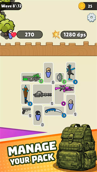 2. 自动战斗与合成升级:战斗中武器随时间刷新,召唤对应士兵作战。每波敌人结束后,可补强背包,相同武器可合成升级(如两把一级步枪合成二级机枪),提升单位属性与生存时间。