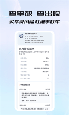 3. 事故记录查询:用户可以查询车辆的历史事故记录,包括出险时间、地点、事故类型和维修记录等详细信息。