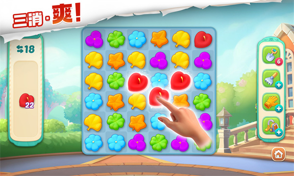1. 玩法融合创新:将三消解谜、庄园建造与模拟经营深度结合,消除关卡推动剧情解锁新区域,种植花卉完成订单获取资源,形成“消除-种植-装饰”闭环。