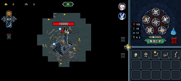 2. 动态防御布局:根据敌人类型调整亡灵阵容,近战敌人多的关卡部署高防御僵尸,远程敌人则用幽灵或元素人克制。塔楼升级优先解锁“亡灵强化”与“资源倍增”技能。