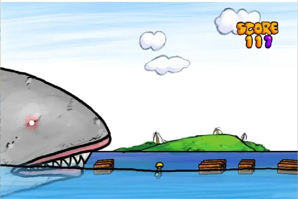 1. 双角色选择:玩家可扮演逃生者或鲨鱼,逃生者需通过方向键移动、空格键跳跃、上方向键投掷炸弹攻击鲨鱼;鲨鱼则通过点击屏幕右侧“SHLFT”按钮控制冲刺,潜入水底后冲出水面捕食飞鸟或人类。