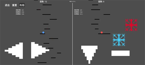 2. 操作方式:手机端采用虚拟按键布局,左方向键控制左侧球体移动,右方向键控制右侧球体移动,下方向键使两球同时下落一层,横键触发跳跃;电脑端支持WASD与方向键控制移动,Z/C键分别冻结左右球体3秒,空格键控制跳跃。