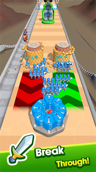 1. 兵种召唤与战斗强化:玩家通过滑动屏幕控制释放角色的移动器,每次移动器自转一圈后,玩家可精准放置士兵攻击关卡道具。攻击数量越多,角色战斗能力越强,最终可解锁更高阶的士兵类型。
