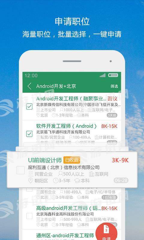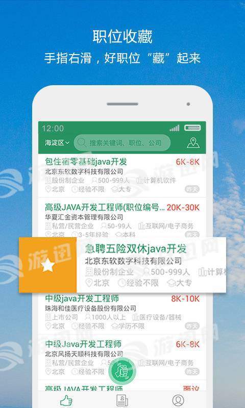 全职招聘找工作,这是款专业的手机求职招聘软件,各种职位都有,支持组合式搜索,智能匹配,轻松获取自己心仪的,可点击收藏,好职位轻松藏起来,方便随时查看。