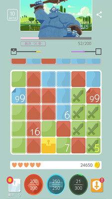 本作是一款通过点击不同颜色的方块累积数字,然后根据数字的大小给敌人造成伤害的消除RPG。当玩家加减乘除后得出的数字是10的倍数时,就可以一口气将所有的方块消除给予敌人极大的伤害。