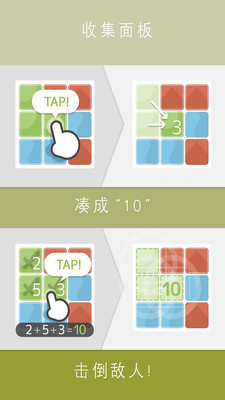 玩家在游戏中可以通过解谜的方式来开启自己的冒险之旅。玩家可以通过点击彼此响亮的方块来让方块上的数字产生不同的变化,系统将会根据变化的数值来给予敌人一定的伤害。如果玩家可以加减乘除算出10或者10的倍数的话,就可以将所有的板块消除,给予敌人极大的伤害。
