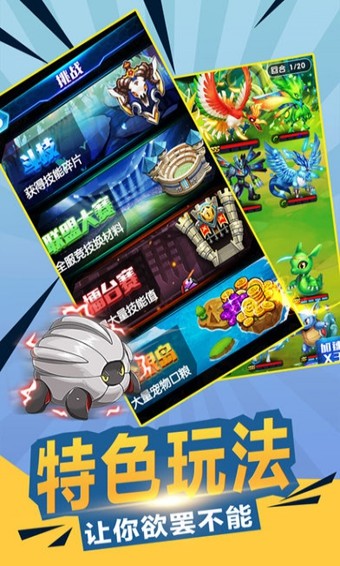 《训练师大冒险》不仅涵盖了卡牌搜集、精灵养成、副本PK等游戏的经典玩法。除此之外,游戏还独创性的增加了精灵特训、扭蛋机、炼化炉等多种特色玩法,让您感受不一样的乐趣。游戏共有上百种萌宠精灵,在这里,您可以看到各种不同的精灵逗萌。