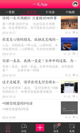 一天app是一款非常不错的打法时间的文选软件,一首歌、一篇文章、十句话、十幅图,让你的时间更加精彩充实,无聊的时候就来看看吧,内容丰富齐全,不断更新,需要的可以一天app使用!