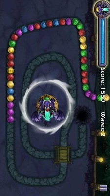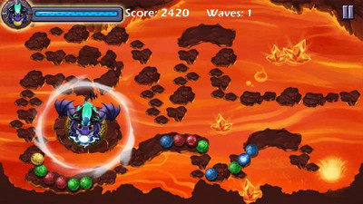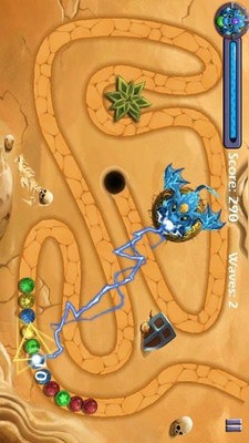 在游戏中你的目的是消除屏幕上沿着轨道前进的所有球,但要赶在球进入场景中的神秘黑洞之前,控制你的龙对准轨道来发射球,三个或以上的同色球接触在一起就会消去。