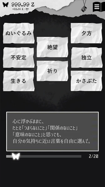 《ALTER EGO》是一款非常出色的点击放置类游戏,以测试为主题,且包含心理测试,整个游戏都充满了高大上的哲学气息,黑白画风也恰到好处,玩起来让你的心情超平静,游戏中的面瘫小姐姐也是超级超级可爱,赶紧下载体验吧!
