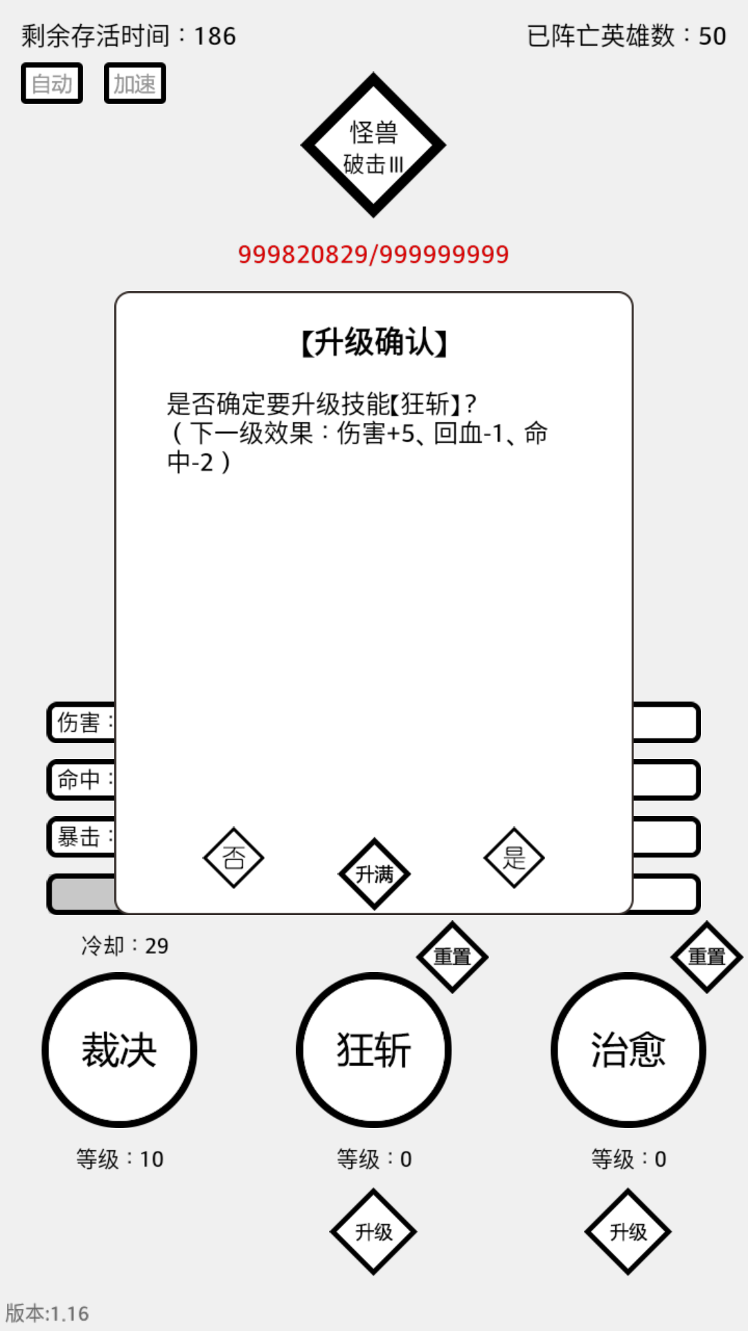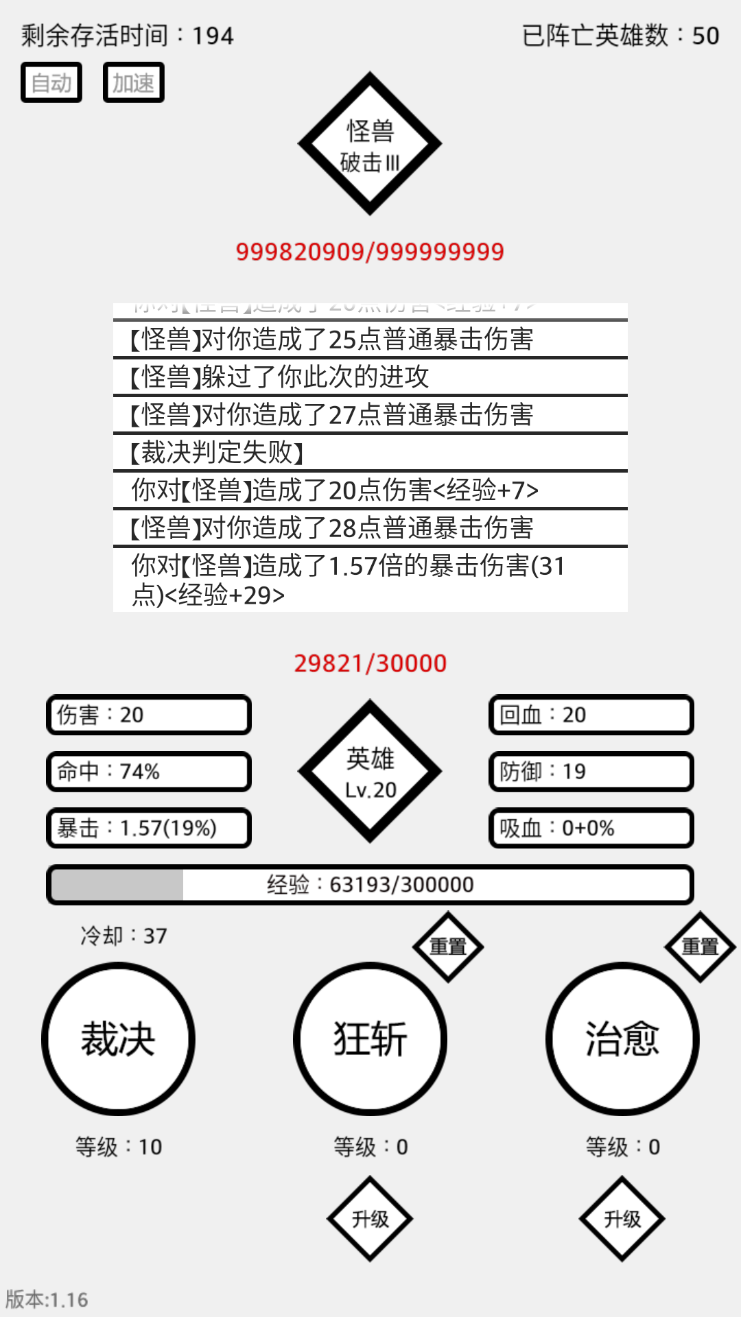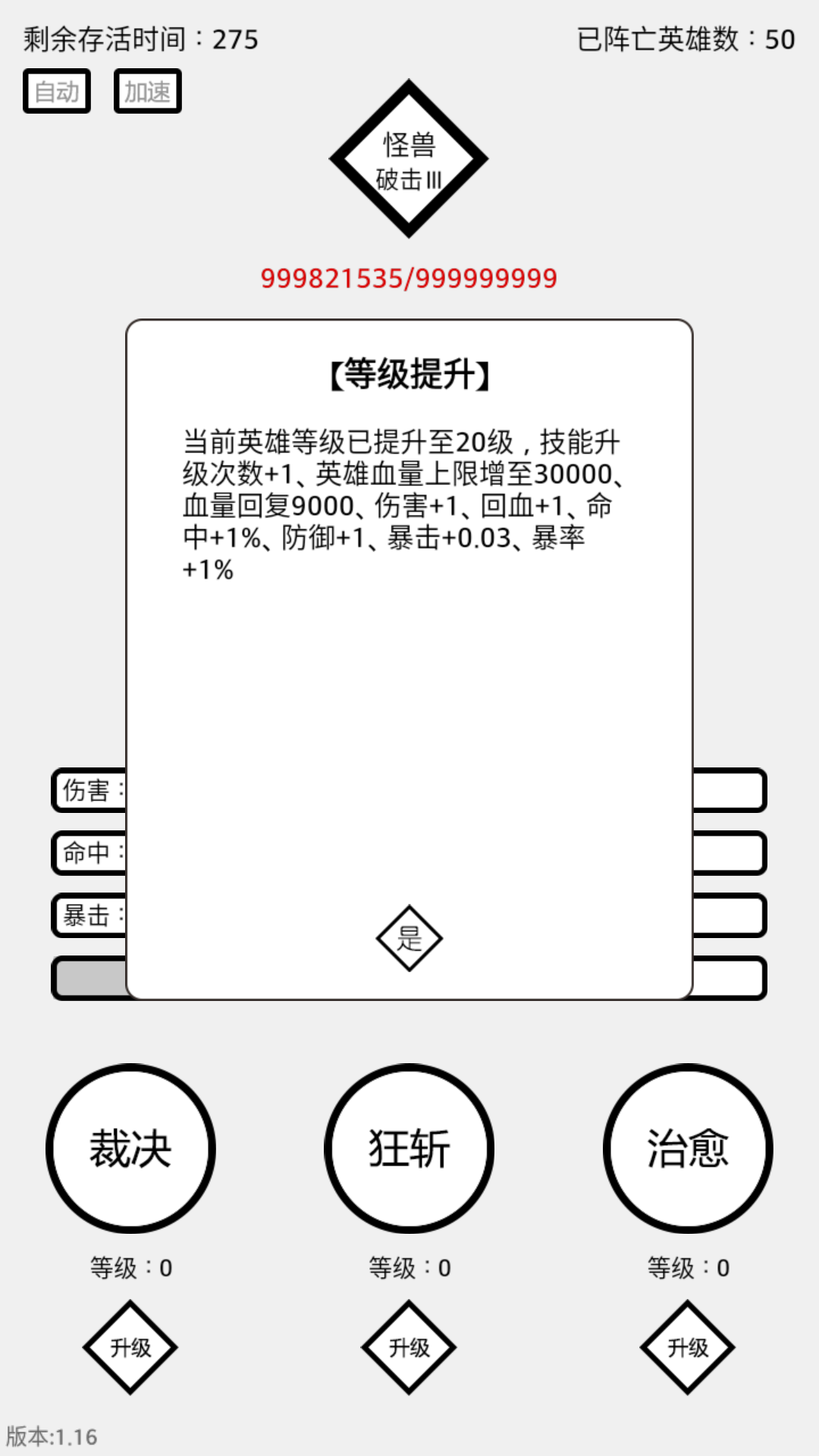 6、英雄等级提升至10级时,将解锁自动点怪功能;20级时,将解锁加速战斗功能。
