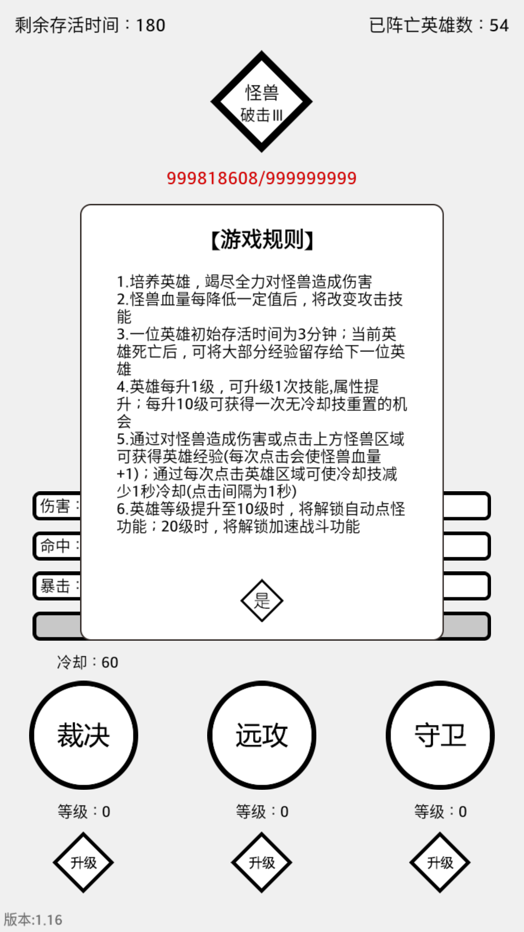 5、通过对怪兽造成伤害或点击上方怪兽区域可获得英雄经验(每次点击会使怪兽血量+1);通过每次点击英雄区域可使冷却技减少1秒冷却(点击间隔为1秒);