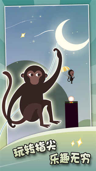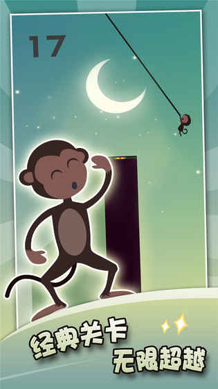 一款精美的平台跳跃游戏,在游戏中你将扮演贪玩的小猴子,利用绳子向着前方的柱子进行跳跃,看准时机,轻点屏幕松开绳子,降落到柱子上,降落点越接近中心得分越高!