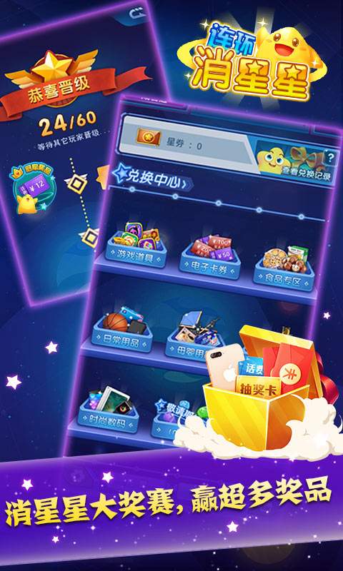 连环消星星是一款比赛版消灭星星,不仅是打发时间的绝佳利器,还是赢话费、星卡、大米、篮球等实物大奖的神器。