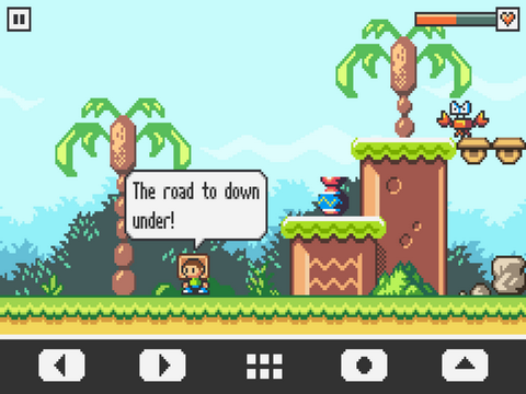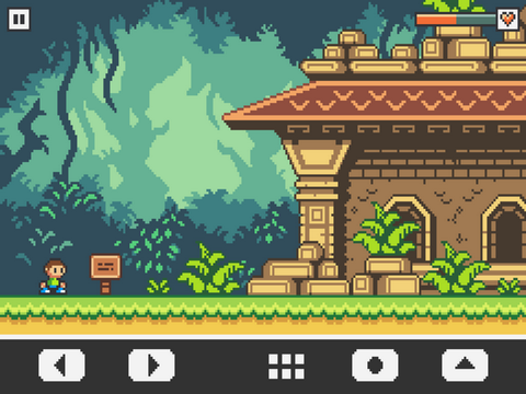 是一款休闲像素风格的动作闯关类手游,游戏中的操作还是非常简单的,所有的操作按键都会集中在画面的下方,左右方向键可以控制角色在场景中的左右移动,而向上的方向键则可以控制角色的跳跃