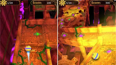 游戏中设置有三大关卡场景可以挑战,小球可以来回地在其中滚动。通过重力平衡感应或是滑屏方式控制小球前进,坐着,趴着,躺着都能玩!收集道路上的铜币,到终点进入圆形漏器中,三盏灯亮起即为过关!