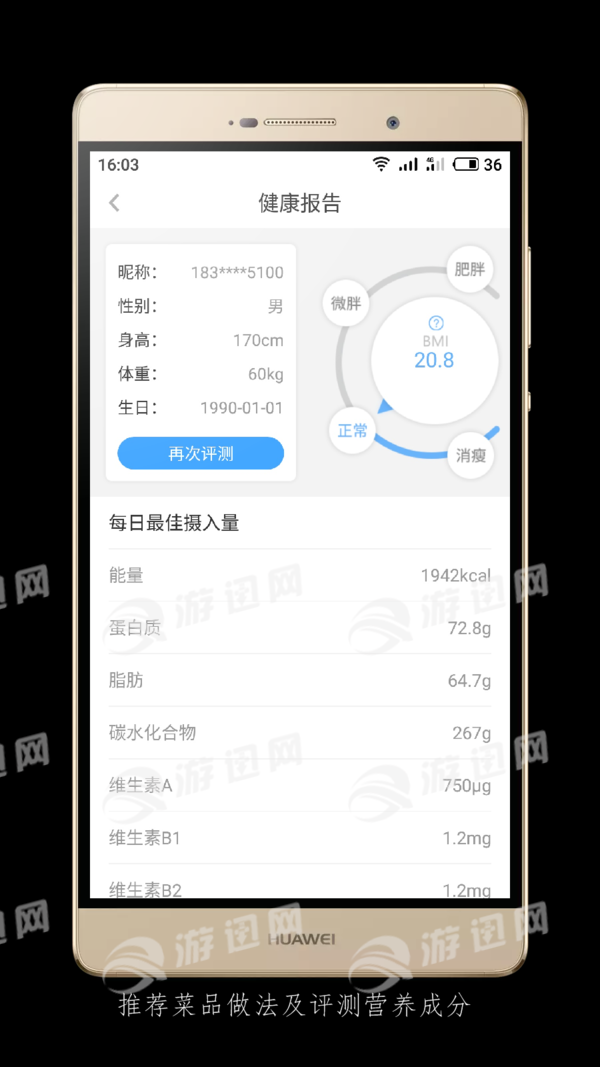 并根据营养评测得出每日营养摄入量,智能推荐菜品,协助用户制定完善的饮食计划,确保每一餐的营养素摄入量,让用户吃的明白,吃的放心。