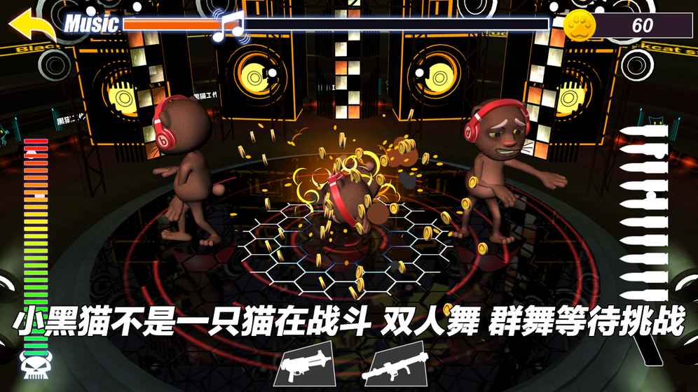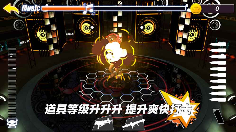 小黑猫是个有梦想的舞者,TA不希望被你打断,所以穿上了奇怪的装备。这时,你会发现即使是火箭筒也就像是挠痒痒。这时候就是升级装备的时刻了;