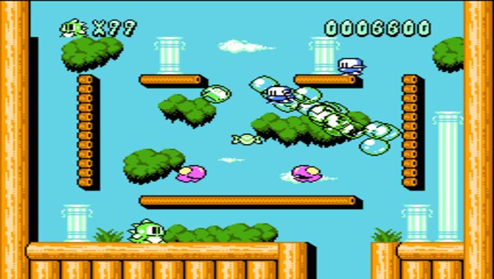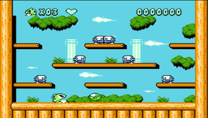 FC版共有2个泡泡龙,他们的玩法都是一样的类似雪人兄弟,和PC版的消除游戏玩法完全不同,2带和1带比起来,画面稍有提升,不过内容方面依然还是没有变。游戏操作依然是控制方向以及吐泡泡和跳跃,不过2里面多了一些新鲜的道具,这一点倒是非常不错,比如流水泡泡,你会跟着流水一起往下冲,一路消灭掉你碰到的怪物!