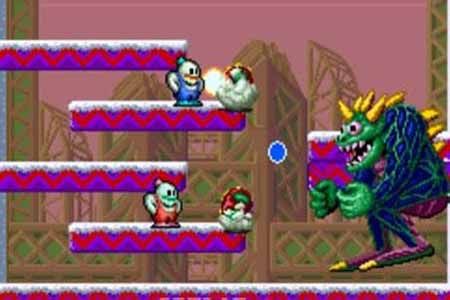 攻击方式是把敌人堆成雪球,破坏雪球或借助雪球去攻击敌。如果一次性消灭敌人的话,天上就掉很多美味可口的年糕。有一个是要牢记的是,主角只能往上跳,不能往下跳(我们一般熟知的方向键向下+跳跃键)。每过一定小关有大BOSS,大小BOSS都有特点。这个游戏还是耐玩的经典之作。