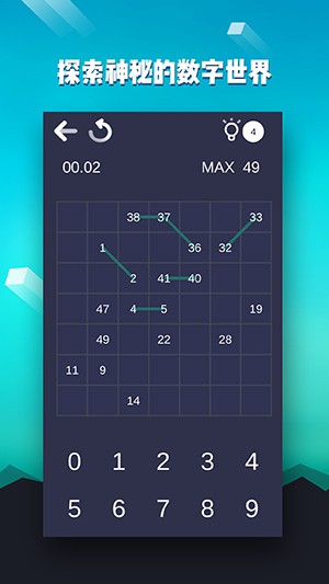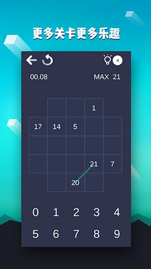 数字迷宫是一个全新的数字解谜与脑力锻炼的游戏。你只要在合适的位置填上合适的数字,使数字依次形成一条连续不断的数字线条。