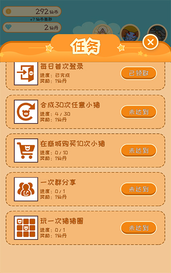 3、完成每日任务,或者达到一定成就会有对应的奖励,一起来帮小猪修炼成猪神吧。