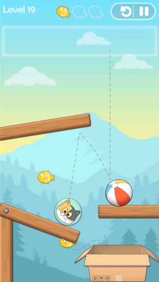 这是一款暖萌系2D物理解谜游戏。游戏目标是帮助一只呆萌小猫安全地回到她的纸箱子中(你知道猫咪最爱住在纸箱子里了)。为了达到这个目标,你可以移动场景中的数个反弹球来将从上方落下的猫咪反弹到纸箱中,同时猫咪落下的位置也是由你来决定的。在反弹猫咪的过程中,你不能让她碰到那些锋利的齿轮,同时还要让她吃到场景中的小鱼。