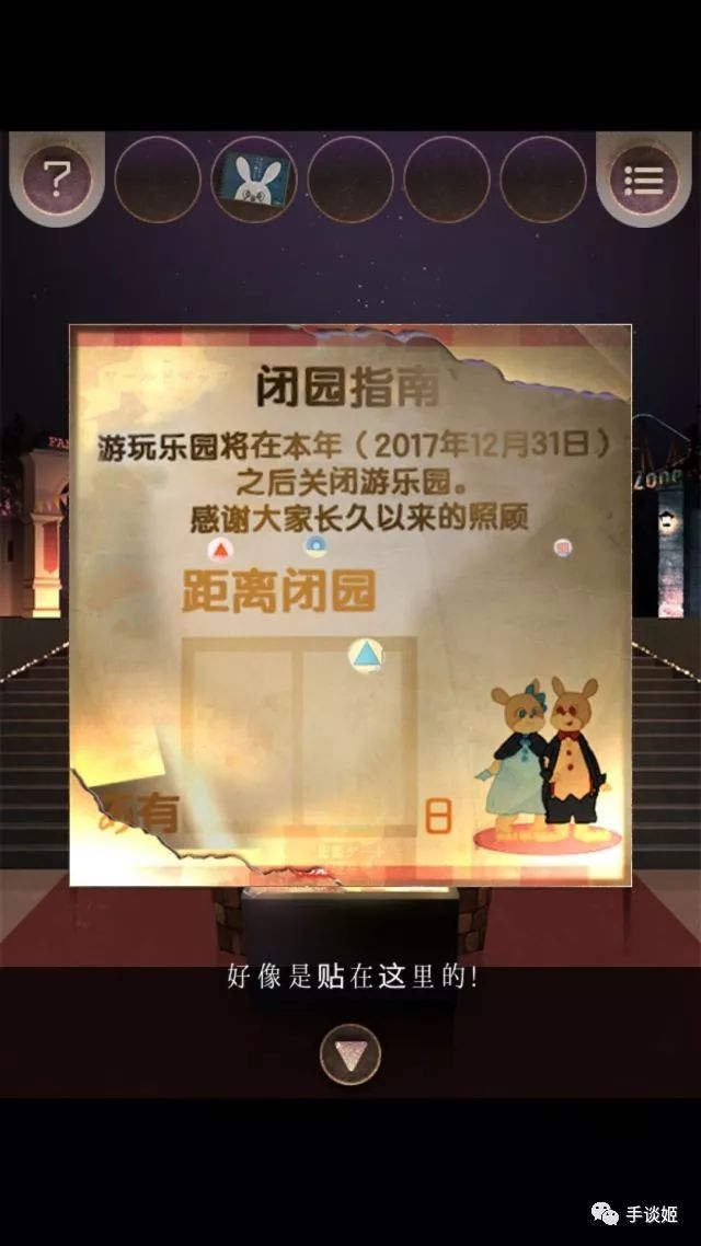 游乐园的地图缺失,需要找到全部碎片,点箭头后退,地上有碎片。进旋转木马乐园,看到操作室关着门,锁是小格子,按照旋转木马的高低顺序就好!木马旋转后拿到车子上的箱子打开拼图就能进入第二关;