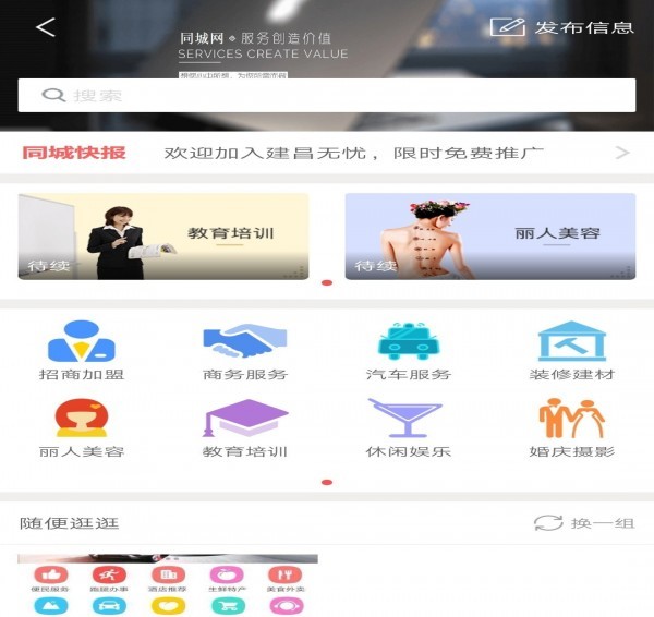 建昌无忧是一款同城综合服务类软件,整合本地资源为用户提供便捷的服务,让用户第一时间就能知道全城的动态,活动促销,需求服务等。