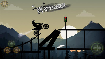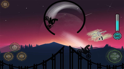 这是一款横版摩托跑酷游戏。游戏拥有十分美丽的游戏场景,不同关卡分别有日落夕阳、傍晚月光、深夜星空三大场景。而主题的摩托则采用极具艺术表现形式的剪影风格。尽情发挥你的运动天赋,表演各种酷炫特技吧。