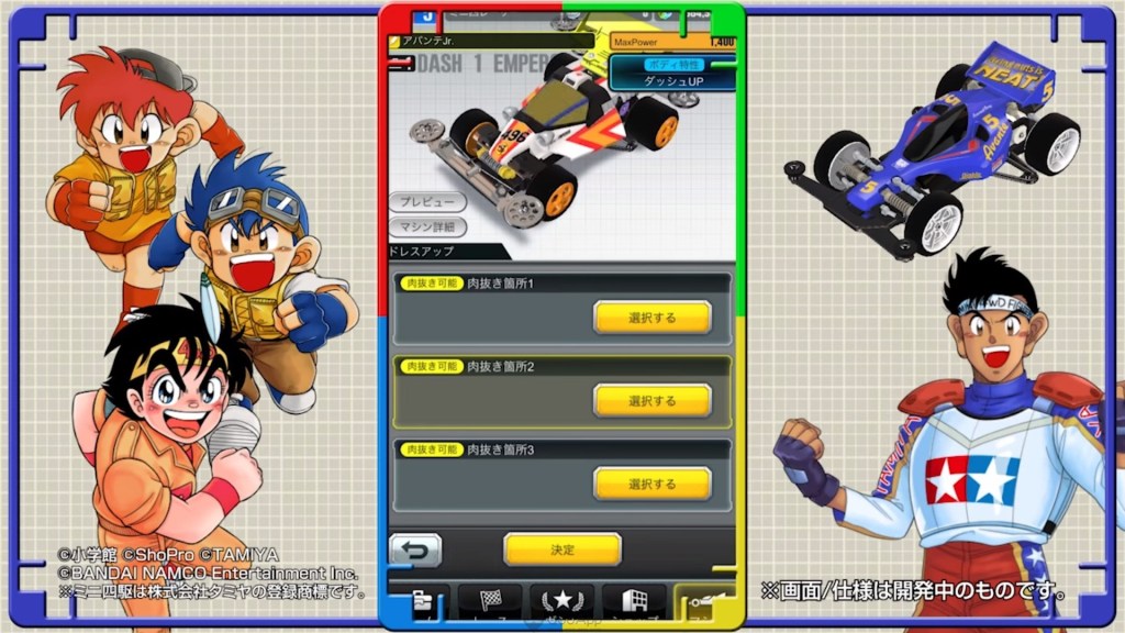 对于广大八零后和九零后玩家来说,童年的记忆里一定都有过放学飞奔回家收看《四驱兄弟》的经历,而各种酷炫好玩的四驱车更是男孩子们梦寐以求的玩具。为了纪念《四驱兄弟》放映20周年,日本游戏公司Bushiroad在近日宣布联合TAMIYA公司旗下人气玩具“迷你四驱车”以及《四驱兄弟》动漫推出一款全新的动作竞速网游——《四驱兄弟-迷你四驱车世界大赛》(レッツ&ゴー!!ミニ四駆ワールドランナー)。