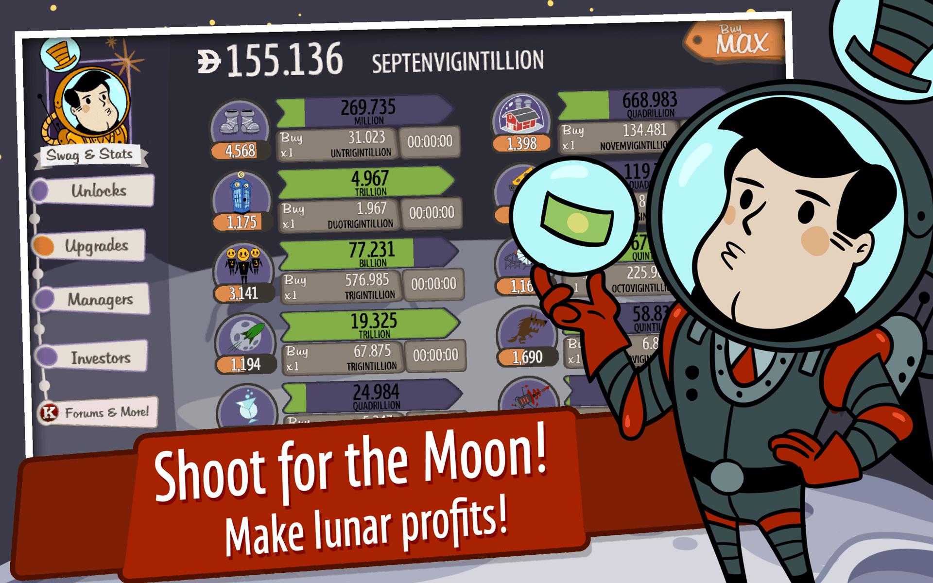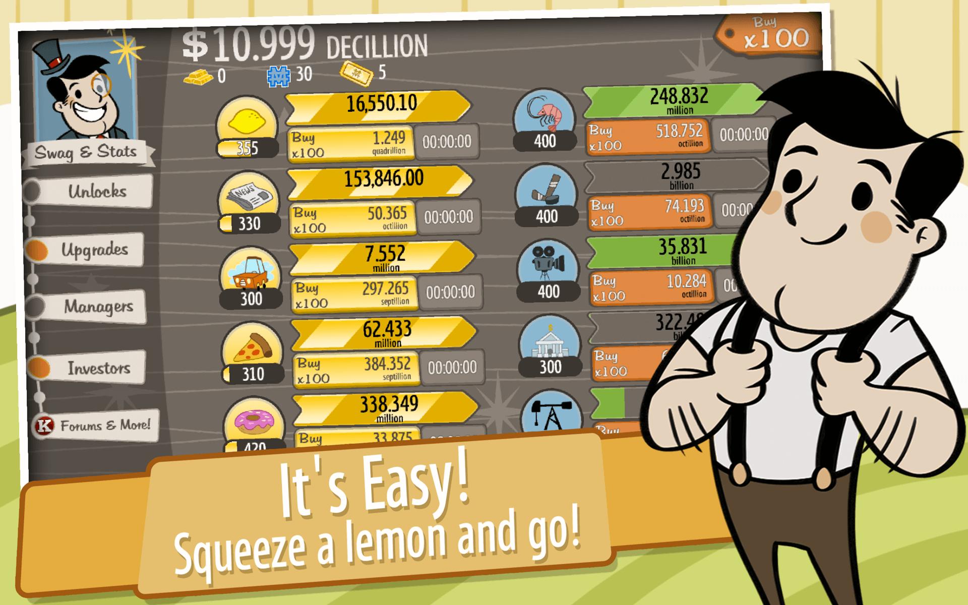 《无尽的资本 AdVenture Capitalist》从一开始的柠檬到报纸,披萨,甜甜圈,还有经营球队,银行,石油等等,赚钱速度会越来越快,但你需要操作的东西会越来越少,十分符合经济逻辑——高层不需要再做体力活。