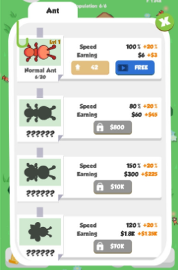 2、使用金币不断的繁衍更多的蚂蚁,解锁各种强大的蚂蚁,快速的搬运更多的食物回家。