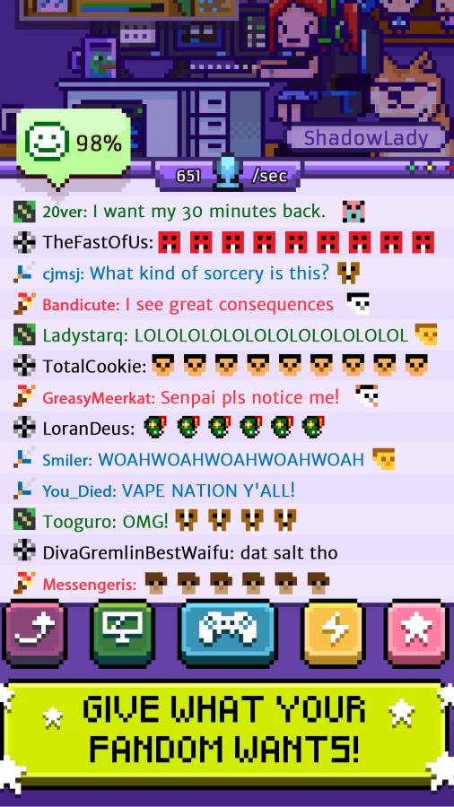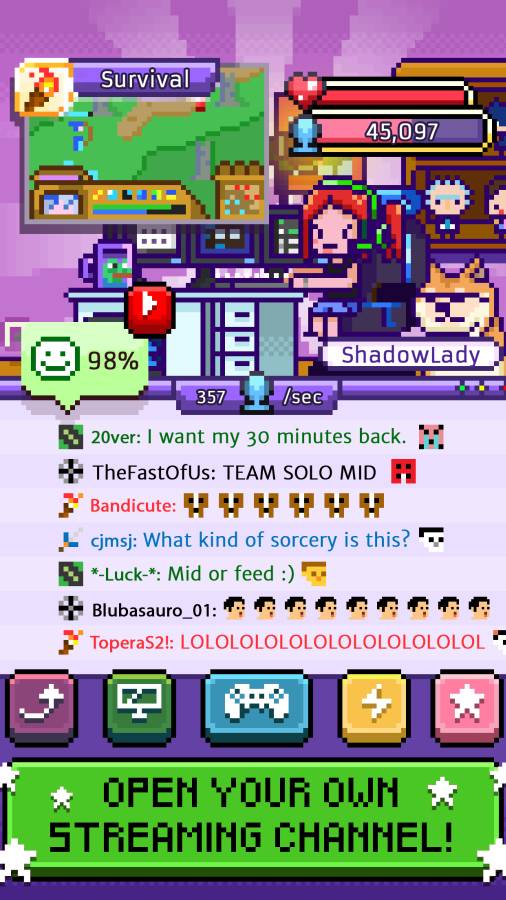 想体验一把做游戏主播的乐趣吗?想感受粉丝们对你的热情吗?那你一定要来试试《游戏主播模拟器》这款像素精品之作,化身为一个游戏大亨,每天直播来吸引更多的粉丝,赚取大量的尽情,升级的配置,最终成为一个著名主播!