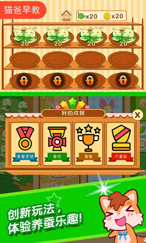 《蚕宝宝农场》是一款面向儿童的模拟养成类游戏,孩子们可以通过游戏了解到蚕宝宝的相关知识,明白蚕茧的价值。从而达到寓教于乐的目的,让孩子开开心心的学到知识。