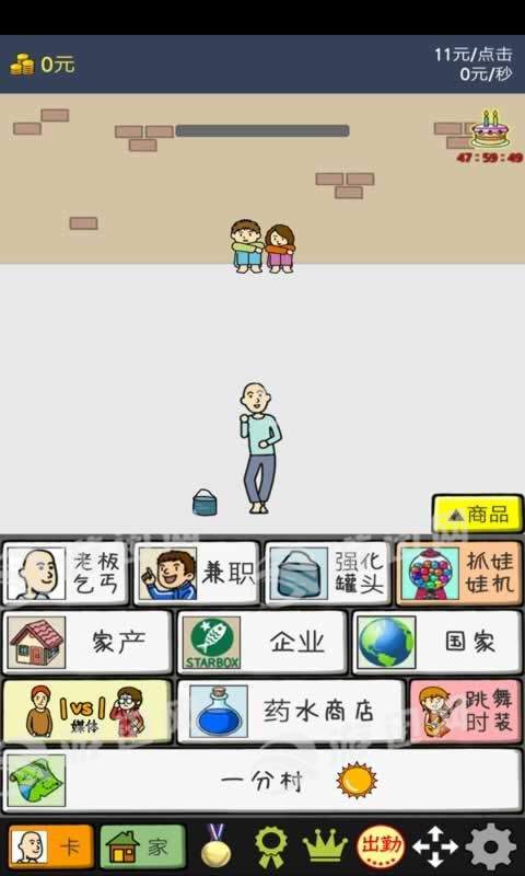 养乞丐2版带你体验乞丐的生活,在游戏中你将扮演一位乞丐,你不仅要想办法生存下去还要赚取更多的金钱,走上人生的巅峰,游戏的玩法很简单,通过打工的方式来赚取你的第一桶金,在一开始你的收入很低,但是后续你的各项能力提升上去之后你就可以获得更多的收入了,投资一些你看好的产业,成为一名商业巨头吧。