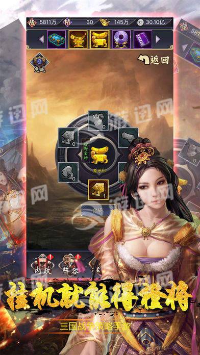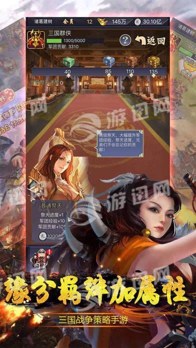 特色玩法,特色养成,忠于历史,还原三国;四方阵营,八路英雄,专属装备,羁绊合击,领兵作战,让您感受一个逼真的三国权倾天下;