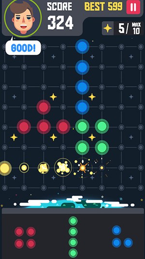 玩法非常简单,将给出的形状放在点阵的合适区域,完成一行或者一列即可消除。游戏支持对战模式,在一定时间内,谁获得的分数高,谁就能获得胜利。