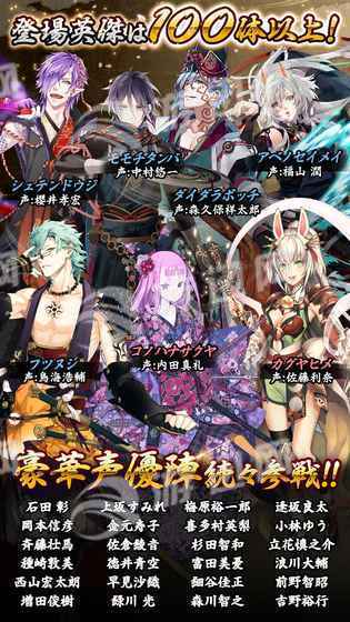 游戏中集结了多达上百位的人、神、妖等角色,有天照、月读、须佐之男等神明,座敷童子、酒吞童子、猫又等妖怪,还有自来也、牛若丸、桃太郎之类的人类。这些角色出自日本一众实力画师之手,包括悌太、黑星红白、huke、pako、先崎真琴等人在内,均参与了人设的绘制。另外配音方面,绿川光、樱井孝宏、福山润、中村悠一等实力声优加盟。