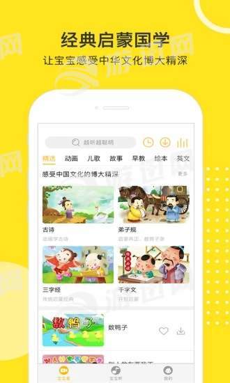 国学:涵盖了唐诗宋词、国学启蒙、百家姓、三字经、古诗新唱-唱古诗、大学、古诗朗诵、蓝迪唐诗、弟子规、甜甜圈三字经、甜甜圈弟子规、故事成语之寓言篇、故事成语之动物篇、成语故事之品格篇、成语故事之历时篇、笠翁对韵、千字文、山海经、中庸、孝经、二十四孝、金刚经、易经-系辞上传、《飞鸟集》精选、国风·邶风、史记、庄子、围炉夜话、尚书_周书等国学经典文化知识。