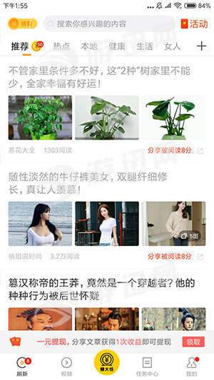 1、自阅获得金币奖励,分享被阅读一次奖励0.08元;