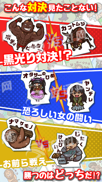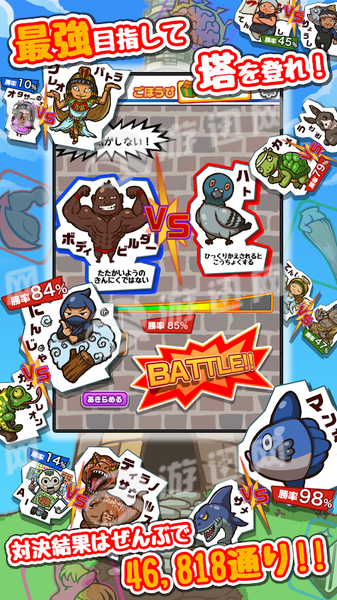 生物混战塔(いきものバトルタワー)是一款日系恶搞玩梗画风的休闲益智竞技卡牌游戏!你需要通过手中的卡牌来与你的对手对决!敌对人物的形象也是千奇百怪,你需要利用它们身上的特性来策略制敌!手中的卡牌就是你的王牌,感兴趣的话就来试试吧!
