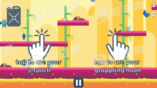 这是一个非常好玩的游戏,控制你的绳索在这个游戏里自由的飞行,你必须勾住那个游戏平台,否则你会很容易掉落,请点击右侧使用你和点击屏幕的左侧使用您的喷气背包,但要小心,你没有太多的燃料,游戏中还有各种各样的挂钩,你可以收集不同的晶体来获取他们,快速的挥动你的钩子,开始你的挑战吧。