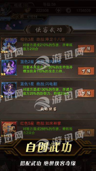 多种侠客卡牌,金古群侠尽在其中,集结最强侠客,于暗黑的武侠世界中生存下去,成为最强的大掌门!