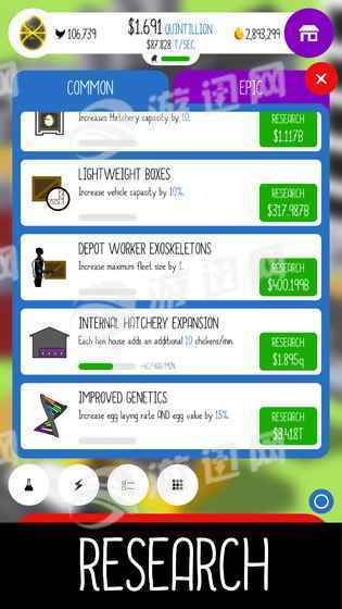 鸡蛋公司(Egg, Inc.)是一款非常魔性上瘾的模拟经营游戏作品!游戏的核心玩法是不断打造出属于你的鸡蛋公司,不断赚取更多的金币,来建造、升级更多的设施,同时完成全新的目标挑战,成就鸡蛋大亨吧!