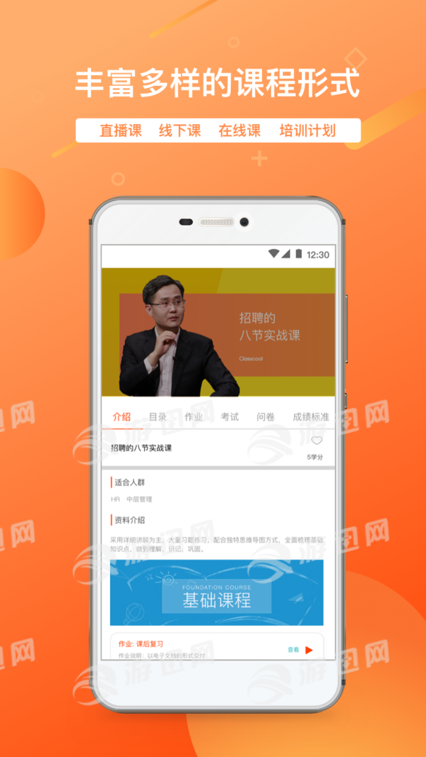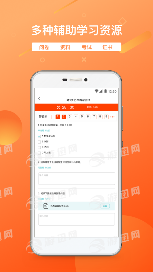 3. 种学习资源辅助学习:考试、资料、问卷、作业等辅助学习项目的资源,保证学习效果与成果的检验。