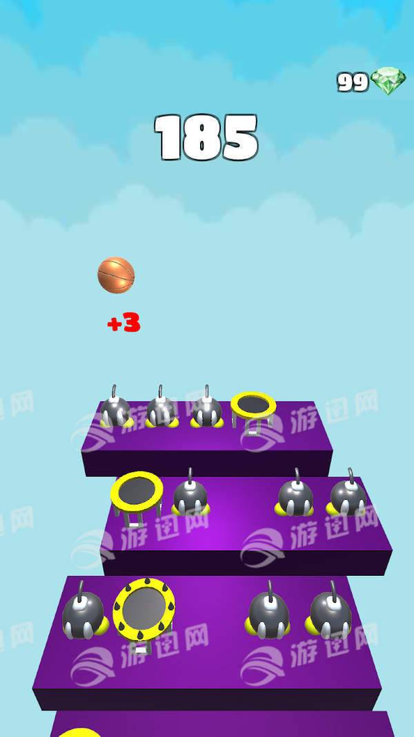 扣篮楼梯游戏以跳跃类的玩法为主,玩家将需要控制着球沿着阶梯进行跳跃,通过左右移动来躲避各种障碍物,并且还能落在蹦床上,快速的进行攀爬。