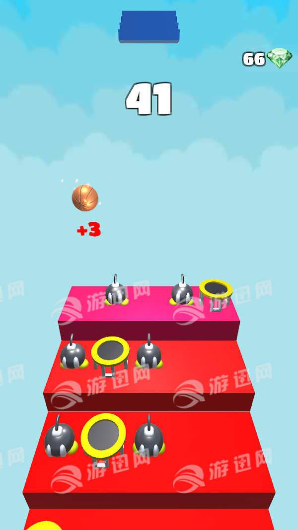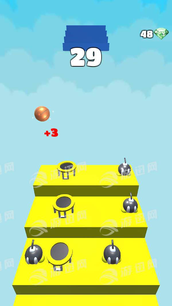 扣篮楼梯是一款十分趣味的街机闯关类游戏,游戏玩法十分加单床,你玩家需要控制一枚篮球在阶梯上不断的进行弹跳,如果落地时触发到了弹床,你就会跳的更高,如果触发到了炸弹,则游戏结束!游戏用用多种不同难度的关卡,难度层层递进,适合玩家反复游玩!赶紧来磨炼一下你的运球技艺吧!